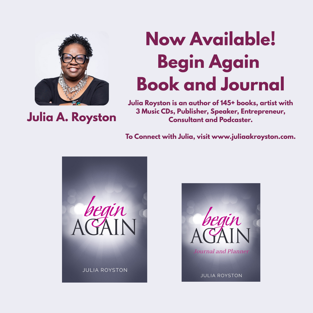 Does your life feel like it needs a do over or start from scratch? Begin Again is a 21 day or week devotional regarding starting again. What are the tools, mindset and resources to make your life the best ever? Sometimes you just have to Begin Again. Starting all over can be hard, rough, tough but necessary. You now have a clean slate and a fresh start. When you Begin Again, you should be smarter, wiser and better. Julia Royston has some experience with starting again. She will give you some key ingredients, steps and processes to “Begin Again.”