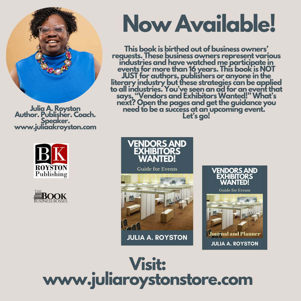These books were birthed out of business owners’ requests. These business owners represent various industries and have watched me participate in events for more than 16 years. This book is NOT JUST for authors, publishers or anyone in the literary industry but these strategies can be applied to all industries. You’ve seen an ad for an event that says, “Vendors and Exhibitors Wanted!” What’s next? Open the pages and get the guidance you need to be a success at an upcoming event. I don’t care whether you see your business as a ‘side hustle’, part-time or full-time, you are still in business. You need to treat it like a business. Any business that doesn’t have some sort of plan or commitment to planning time, will ultimately fail. You can’t keep going and never stop to evaluate, review and take stock of where you’ve been, what you’ve done and what you have been able to accomplish. Events are key to getting in front of new audiences, displaying what you have to offer and hopefully, gain a new customer. No matter your industry, get the most from events. Take some time, Turn the Page and Plan for Purpose and Profit. Let’s go!